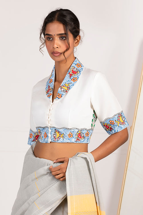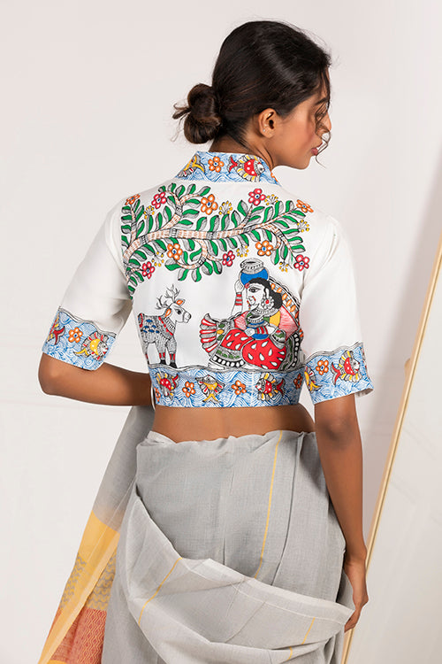 Every stroke tells a story. This handpainted blouse is crafted on pure fabric and adorned with intricate brushwork done by artisans. Inspired by the timeless beauty of Indian folk art, each piece features delicate motifs like [Radha-Krishna / peacocks / florals / fish / birds] that celebrate culture, nature, and craftsmanship.